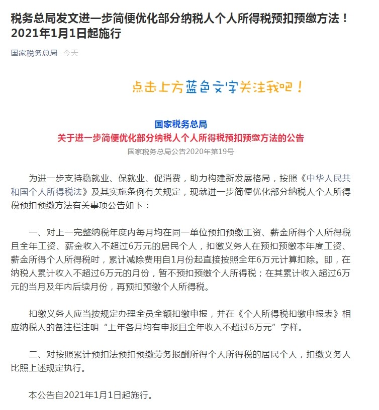 税务总局 累计收入不超6万月份 暂不预扣预缴个税 腾讯新闻