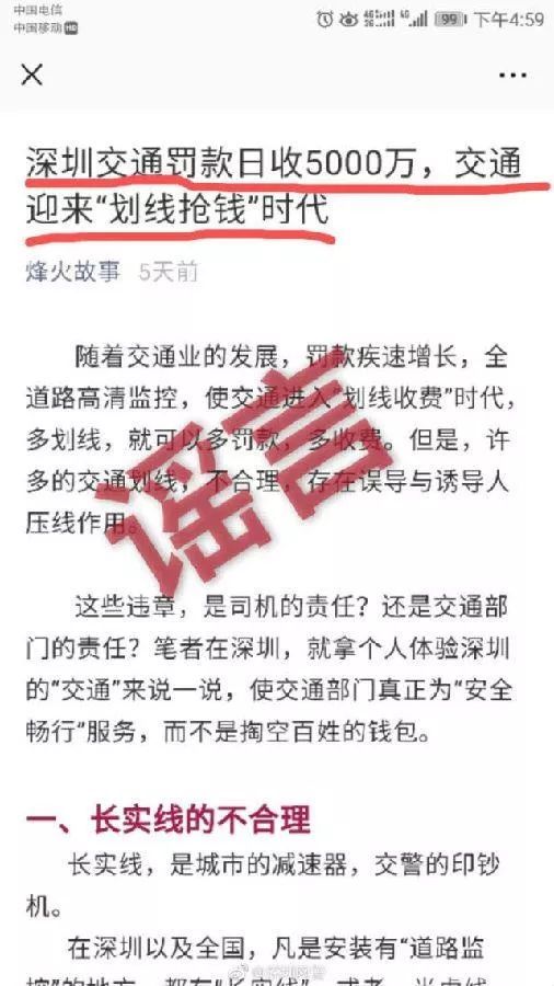 公号捏造 深圳交通罚款日收5000万 男子被传唤写悔过书